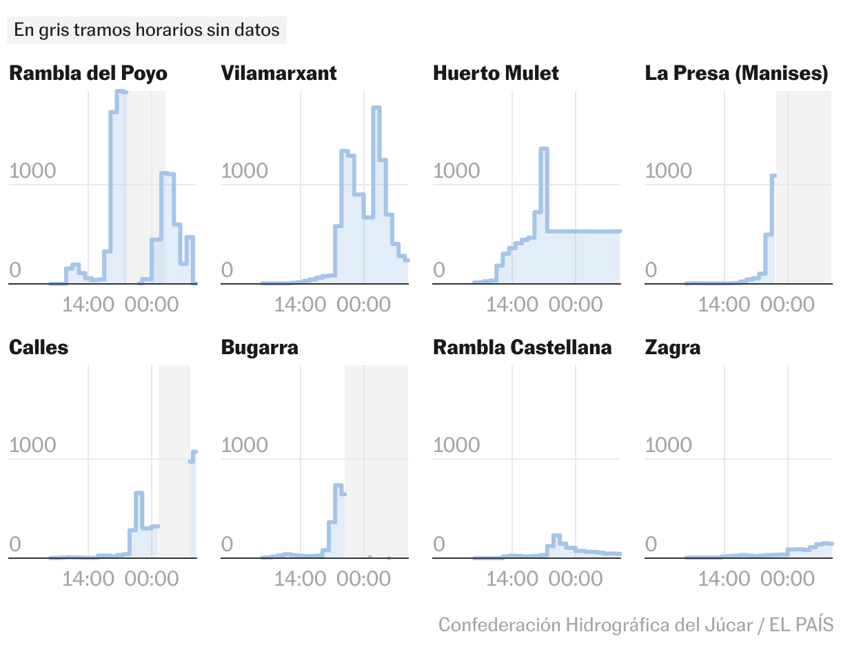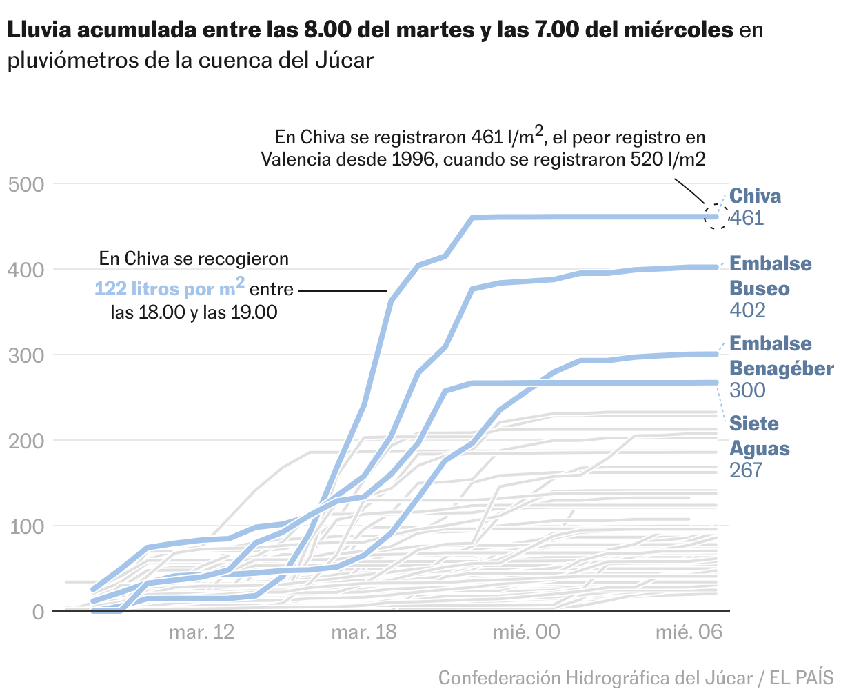 Como se ve en el siguiente gráfico, los más de 160 pluviómetros de la Confederación Hidrográfica del Júcar muestran la descarga torrencial del agua: el martes a primera hora de la mañana el registro máximo eran 34 litros por metro cuadrado. A las 13.00, una estación es la primera en superar los 100 litros por metro cuadrado, en la sierra del Ave, en el interior de la provincia. Al final del martes se superaría ese nivel en una veintena de pluviómetros. Las horas más críticas del temporal llegaron tras el mediodía. Entre las seis y las siete de la tarde, el pluviómetro de Chiva llegó a registrar más de 120 litros por metro cuadrado. El siguiente gráfico muestra la tromba que sufrió la provincia de Valencia.