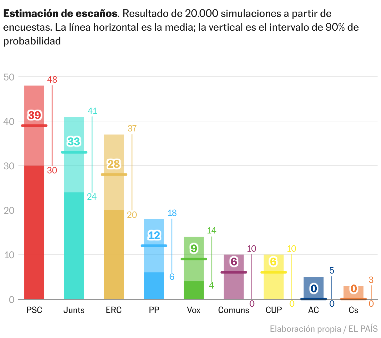 Es fácil ver la incertidumbre. Por ejemplo, según estos cálculos, el resultado más probable del PSC sería rondar los 39 escaños, pero su intervalo de 90% de probabilidad va de 23 a 42 asientos. Y no son márgenes teóricos: el último pronóstico del CEO le daba a los socialistas hasta 47 escaños.