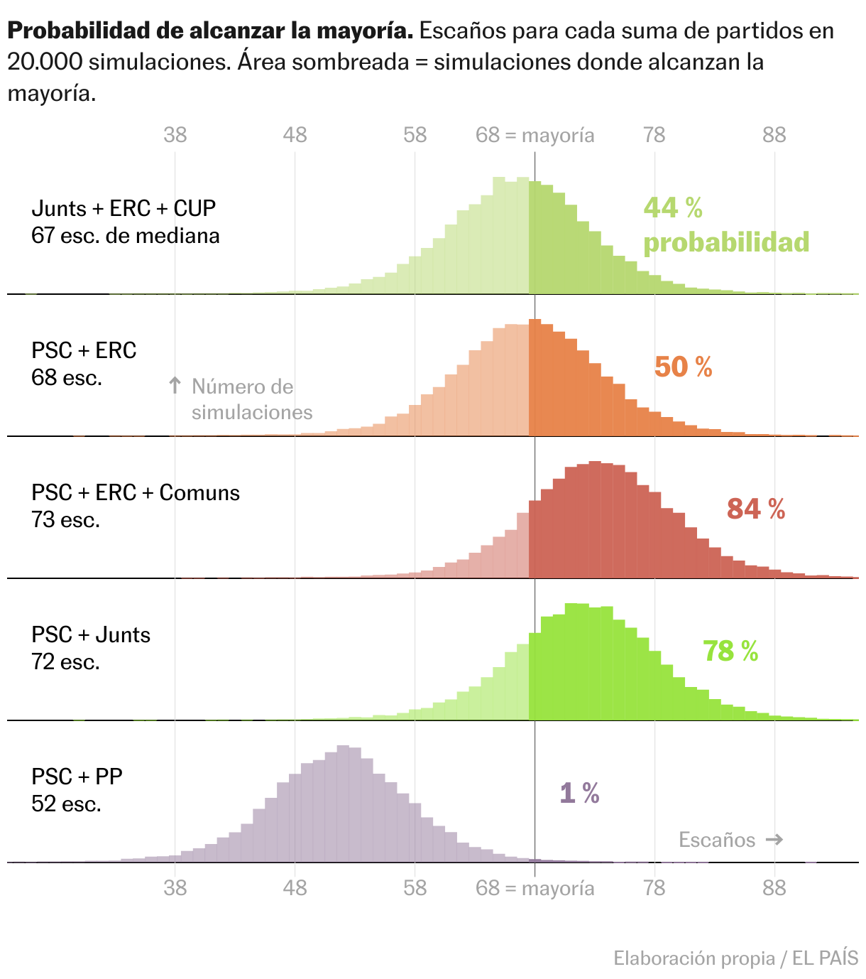 La gran ventaja de tener un modelo de predicción es que podemos atribuir probabilidades a cada resultado. Así podemos enfrentar la pregunta fundamental de las elecciones: ¿qué partidos pueden alcanzar la mayoría? El gráfico muestra la probabilidad que tienen diferentes sumas de lograr los 68 escaños necesarios para gobernar Cataluña.