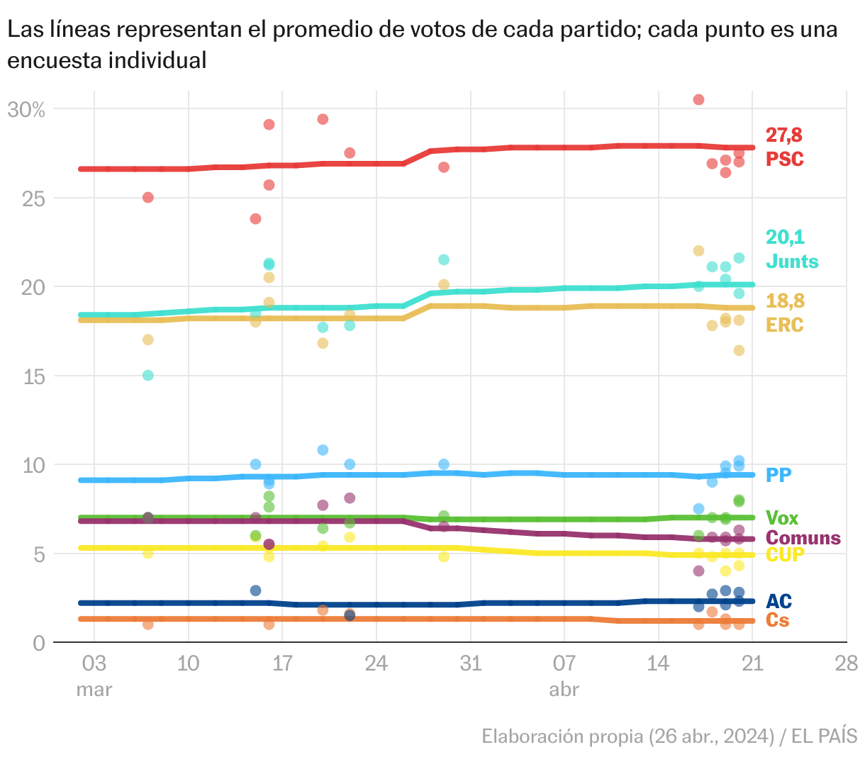 Ahora mismo, nuestro promedio de encuestas coloca al PSC como primera fuerza, con alrededor del 28% de votos, seguido de Junts (20%), ERC (19%), PP (9%-10%), Vox, (7%), Comuns Podem (5%), CUP (5%), y una nueva formación de ultraderecha e independentista, Alianza Catalana (2% o 3%).