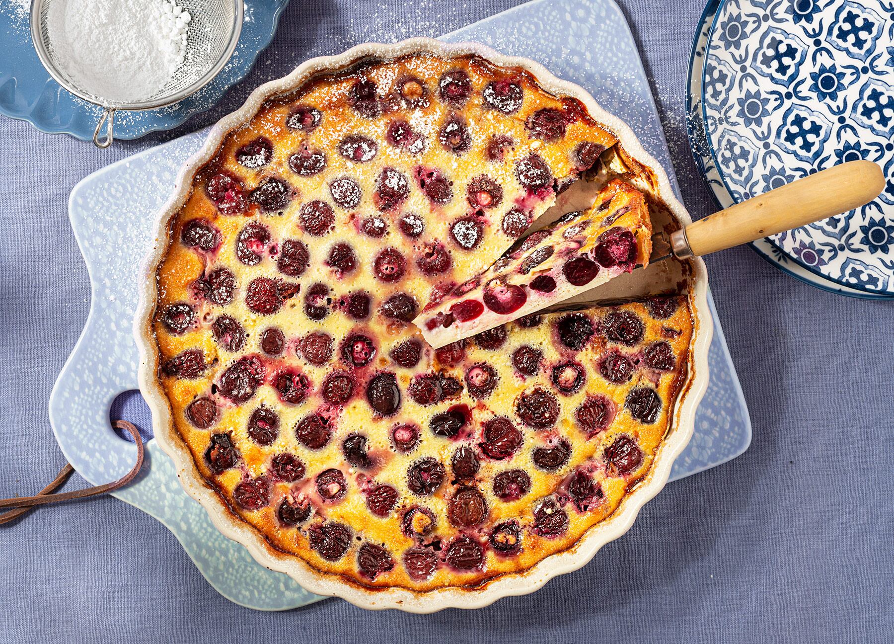 Sobra decir que el clafoutis es de cerezas. Este dulce, que tan solo data del siglo XIX, es como una tortita gigante de estas frutillas, pues la masa que las une consta solo de huevos, leche, azúcar y, en ocasiones, algo de mantequilla y harina para aportar algo de cohesión. Es una tarta facilísima de hacer y muy lucida para el poco esfuerzo que lleva, perfecta para la temporada de cerezas.