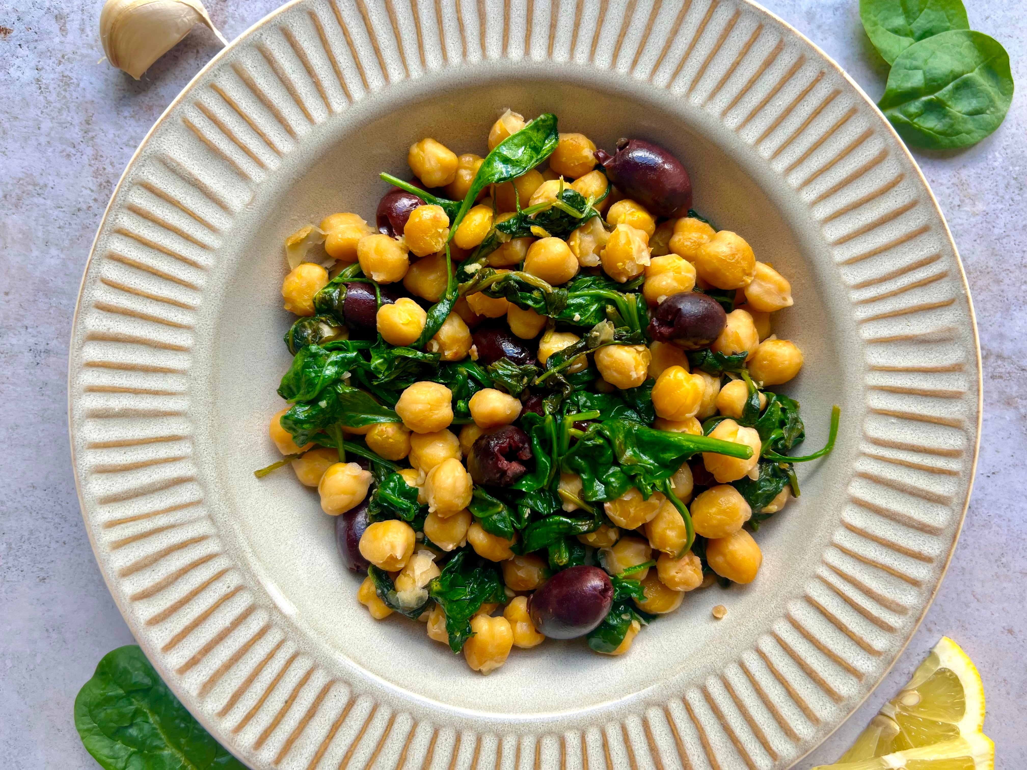 Cuando era pequeña, mi abuela cocinaba legumbres cada lunes. Era nuestro día sin carne, y sigo con esa costumbre porque funciona muy bien y mis hijos saben que lunes es el día de legumbres. Esta receta de garbanzos salteados con espinacas, limón y aceitunas kalamata es perfecta para esos días en los que necesitas comer bien sin pasar demasiado tiempo en la cocina. Está lista en 10 minutos, puedes acompañarla con arroz, guardar lo que sobre para el día siguiente, o enriquecerla con un poco de queso feta o un huevo.