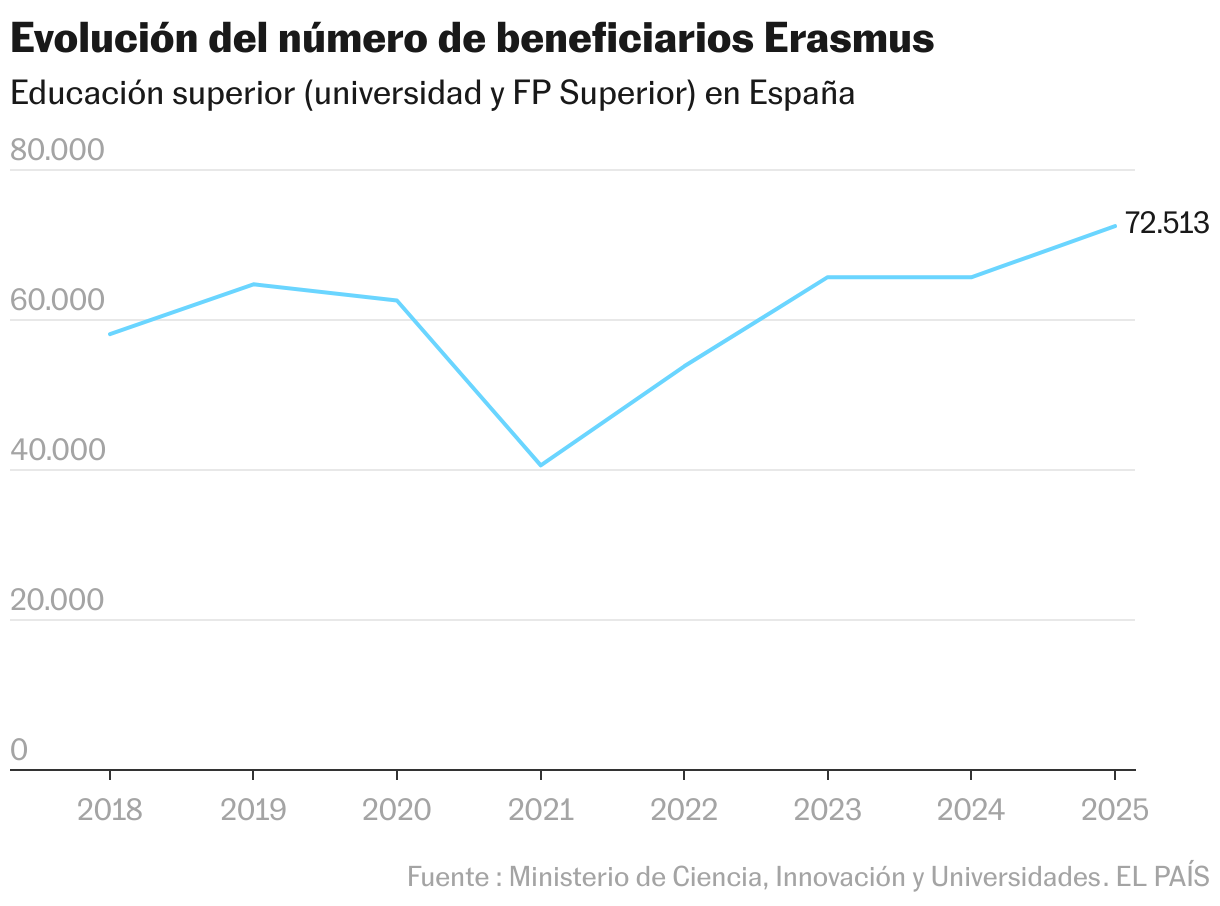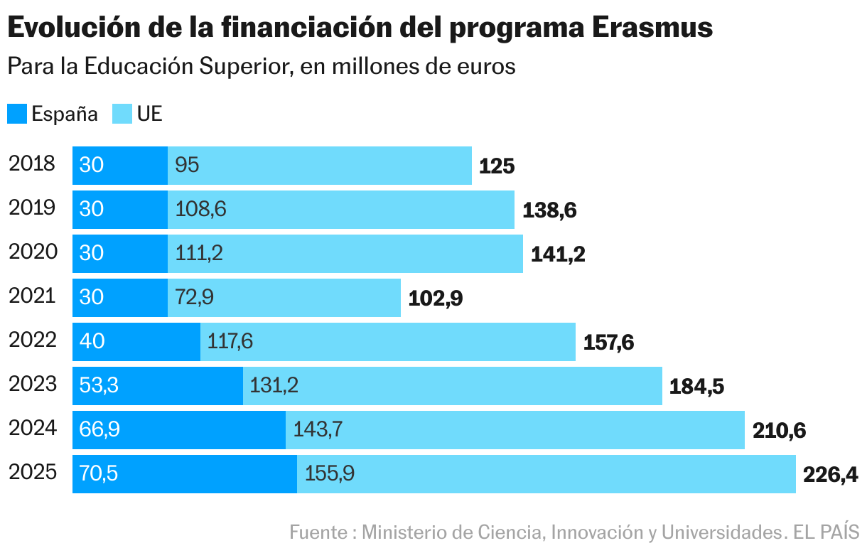 En dos años se acaba el millonario plan plurianual de financiación de Erasmus+ (2021-2027, que duplicó el anterior) y, aunque en Bruselas saben que nada ha cohesionado y vertebrado más Europa que este programa de movilidad entre universidades y centros educativos, está por verse si sube o no la partida ahora que la UE parece tener una prioridad muy diferente: rearmarse. Pero, al menos, en este 2025 se va a alcanzar en España el récord histórico en inversión en los 38 años de andadura del proyecto: se prevé invertir 377 millones de euros para becas a universitarios, estudiantes de FP, escolares o docentes. En total se va a financiar 4.538 proyectos de movilidad que beneficiarán a 153.717 personas.