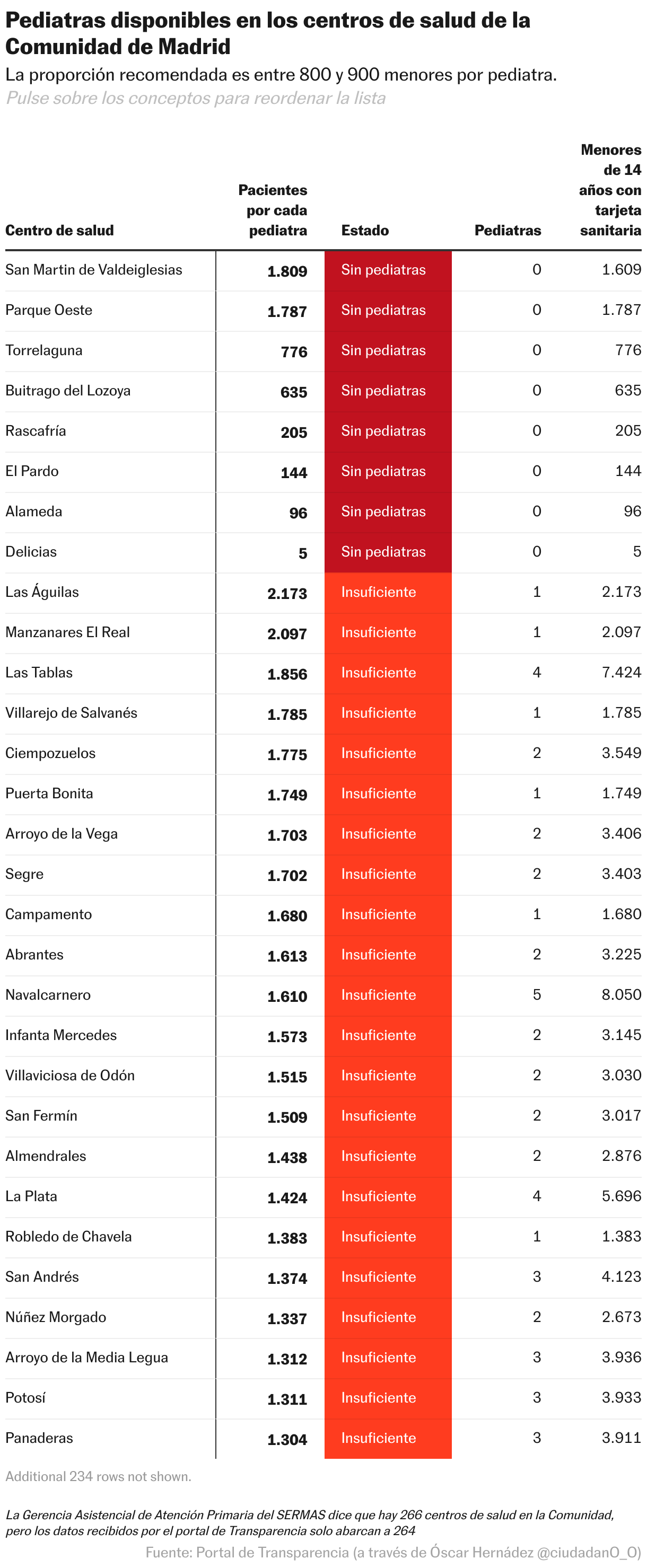 “Es imposible que un médico atienda a todos los niños del pueblo el día que va al centro de salud”, asegura Dora Bejarano, pediatra y responsable de esta área en el sindicato de médicos Amyts, que ocupa ese mismo puesto desde hace 17 años. EL PAÍS calculó que hasta agosto de 2024 el 48% de los centros de salud de Madrid superaban el ratio recomendado de niños por pediatra ―incluyendo a centros con mayor ratio y directamente sin médico, y teniendo en cuenta tanto a especialistas en pediatría como a médicos de familia en puestos de pediatras―, según datos que obtuvo del Portal de Transparencia el ciudadano Óscar Hernández, al que los sindicatos médicos reconocen por su labor investigadora, datos que ha cedido a este diario.
