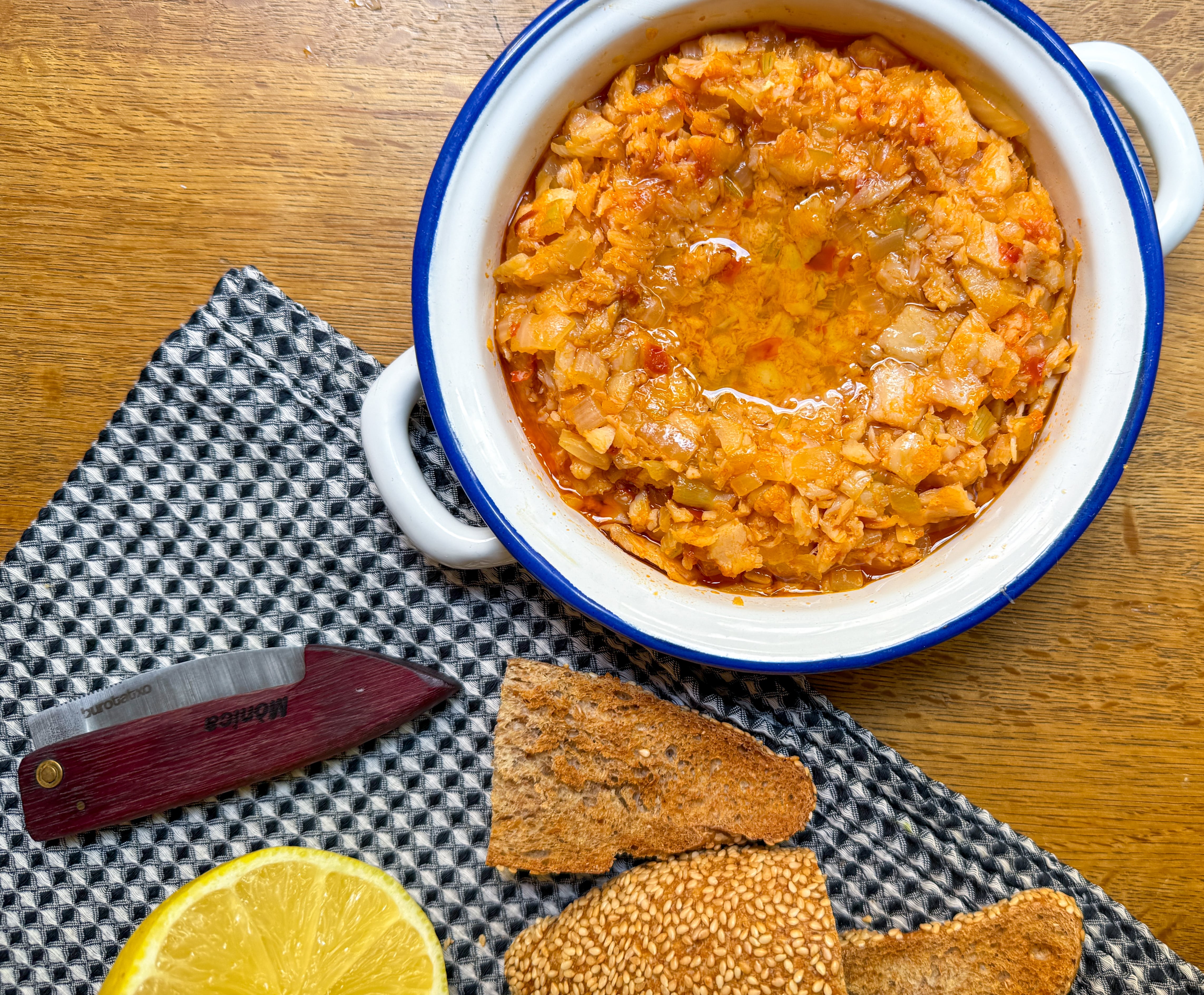 La gracia del rin ran está en su sencillez: con muy pocos ingredientes se consigue un bocado intenso, fresco y adictivo por la combinación del bacalao meloso, ñoras ahumadas, cebolla aún crujiente, aceite de oliva y un chorrito de limón al que le añadí un poco de ralladura (algo seguramente nada canónico, pero muy aromático). Tampoco tiene mucho sentido ponerse purista en este tipo de preparaciones, en las que las proporciones o el aliño varían con cada receta familiar. Lo que no me saltaría es acompañarlo con un pan bueno recién tostado y caliente, que hace que la grasa se funda un poco y le da un contraste crujiente perfecto a cada bocado.