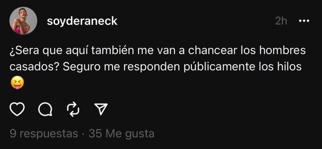 “¿Será que aquí tambien me van a chancear los hombres casados? Seguro me responden publicamente los hilos” escribió la venezolana, lo cual deja entrever que recibe constantemente mensajes por parte de hombres comprometidos ¿Qué tal?
