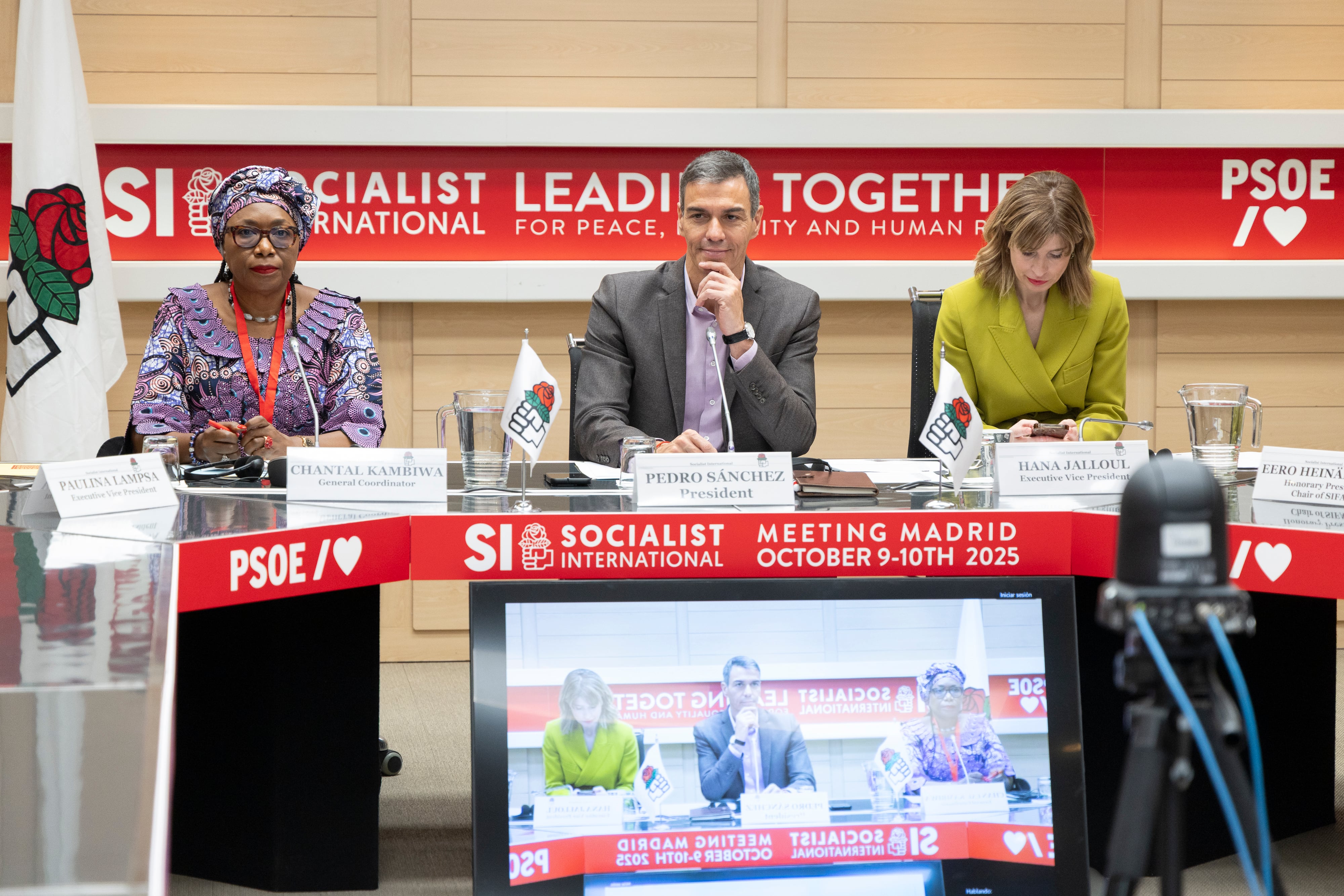 Las críticas de Donald Trump contra Pedro Sánchez por ser la excepción de la OTAN y negarse a destinar el 5% del PIB de España a gasto militar ha coincidido con la reunión en Madrid del Presídium de la Internacional Socialista, la cúpula de la organización fundada en 1951 que agrupa a 132 partidos socialistas, socialdemócratas y liberales de todo el mundo que el presidente del Gobierno y secretario general del PSOE preside desde 2022. El encuentro se suele celebrar cada año en Nueva York durante la semana de la Asamblea General de las Naciones Unidas, pero las restricciones de Estados Unidos a la concesión de visados, como sucedió con la delegación palestina, ha provocado que se celebrase en la sede socialista de la calle Ferraz.