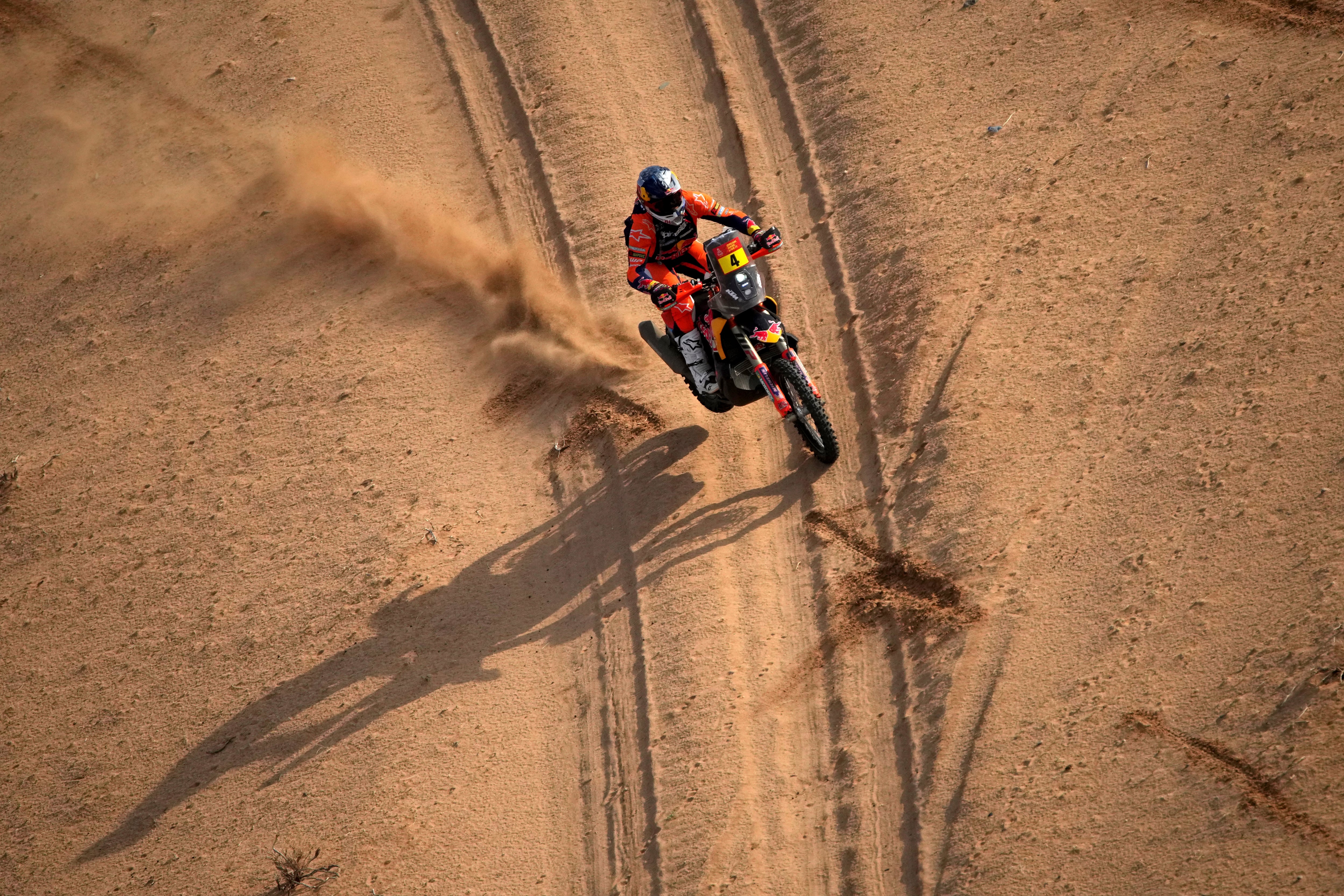 Hacía casi una década que un piloto de motos no dominaba el Rally Dakar de esta guisa. El australiano Daniel Sanders y su KTM volvieron a mostrarse intratables bajo el aguacero en pleno desierto de Arabia Saudí para ganar la séptima etapa de la edición de 2025, una especial en bucle alrededor de Al Duwadimi con 460 kilómetros todoterreno cronometrados y más de 700 contando los enlaces por carretera. Ni la lluvia ni la presión de verse cada vez más cerca de su primer trofeo Touareg hicieron titubear al piloto de 30 años, que completó el recorrido de la jornada en 4h10m33s y volvió a ganar terreno sobre el resto de los perseguidores.