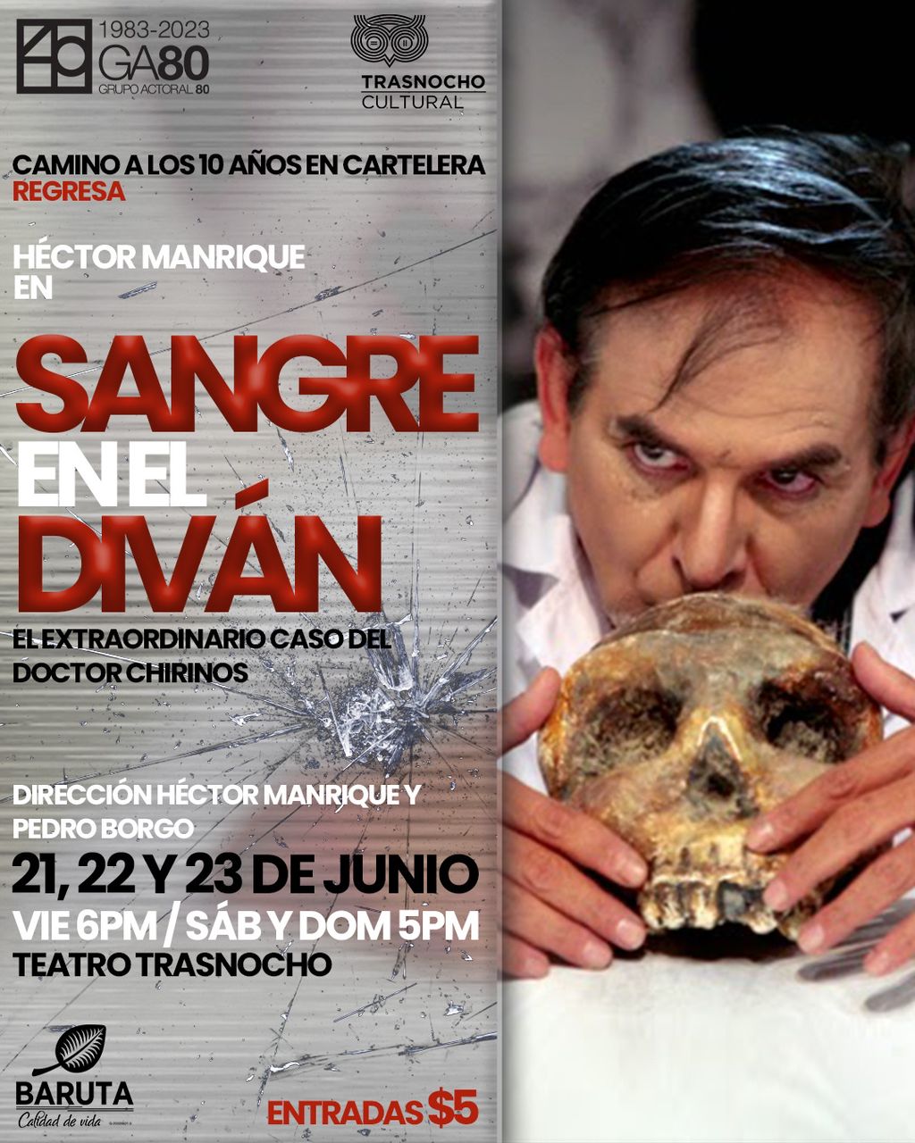 Luego de funciones a sala llena y agotadas en lo que va de 2024, año en el que celebrará una década de presentaciones a nivel nacional e internacional, regresa solo por tres funciones especiales al Trasnocho Cultural, el exitoso monólogo “Sangre en el diván”, protagonizado por el actor y director Héctor Manrique; con presentaciones este viernes 21 de junio a las 6:00 pm, sábado 22 y domingo 23 de junio a las 5:00 pm en el Teatro Trasnocho.