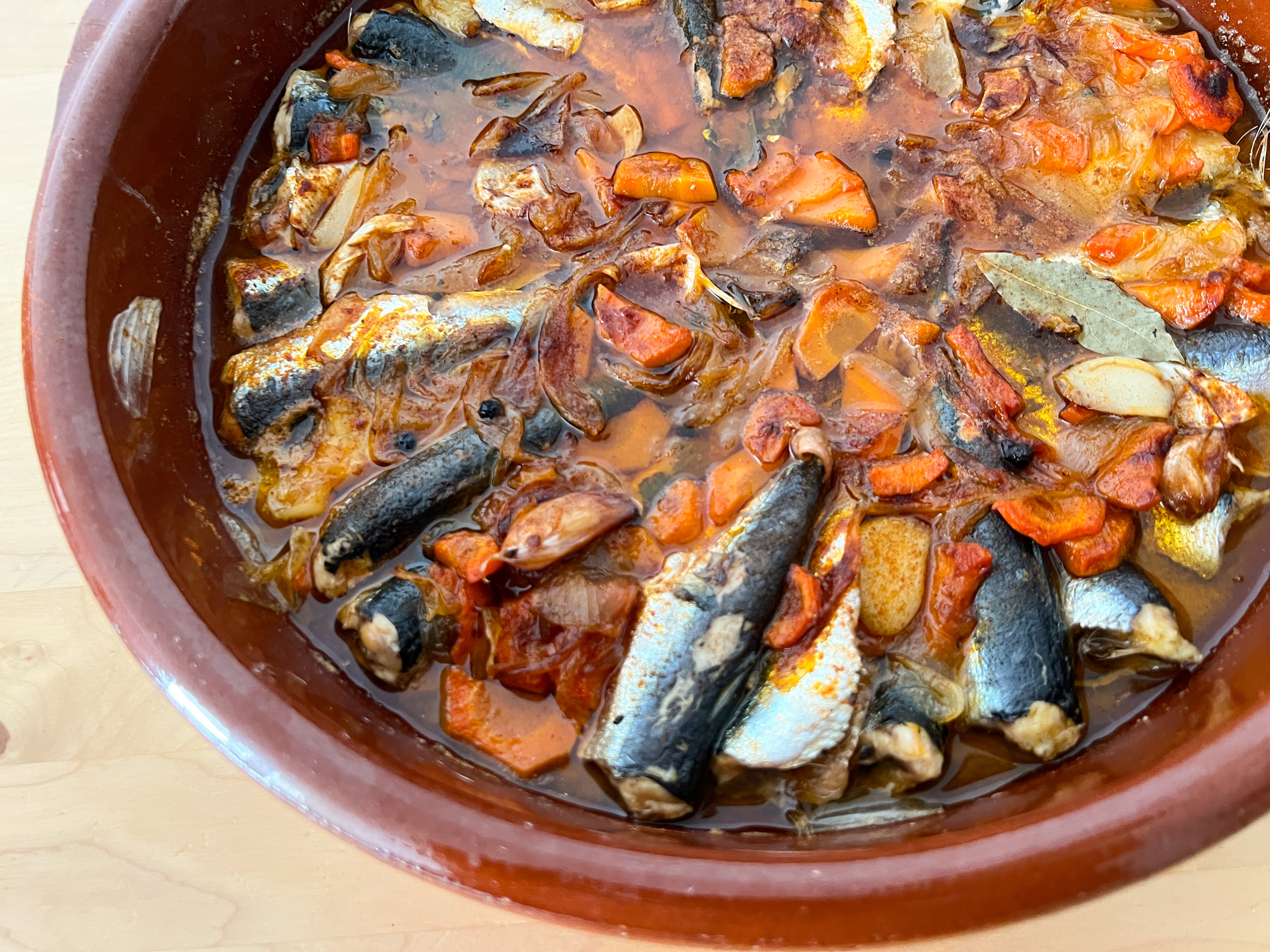 Dejar enfriar en el mismo recipiente, cubrir y llevar a la nevera (idealmente, al menos 24 horas). Servir las sardinas con la parte proporcional de verduras y algo de jugo del escabeche y pan, patatas cocidas, arroz o cualquier cosa que recoja la salsa.