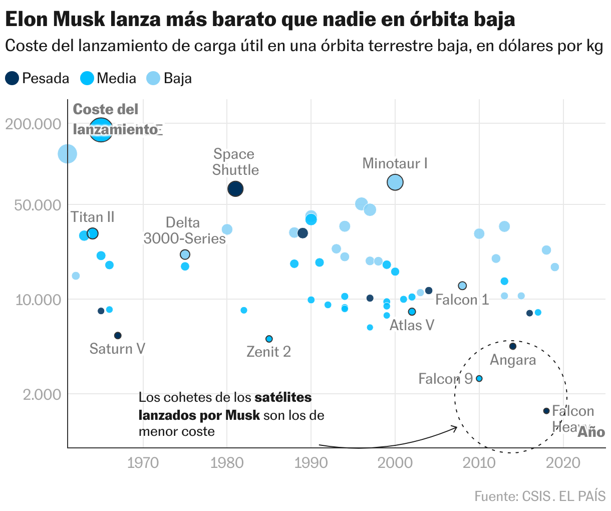 Al igual que ha sucedido con los paneles solares, el precio del espacio cae. El coste de los lanzamientos comerciales, según la NASA, a la Estación Espacial Internacional ya es cuatro veces más barato. La cifra equivalente para la órbita terrestre baja es de 20. Los transbordadores espaciales han pasado de 54.000 dólares por kilo a 2.720 dólares. ¿Poco? Aguarden a la disrupción de Elon Musk con SpaceX. Los Falcon 9 (2010) y Falcon Heavy (2018) han reducido el precio a 1.140 dólares el kilo. El cosmos parece cada vez más cerca.