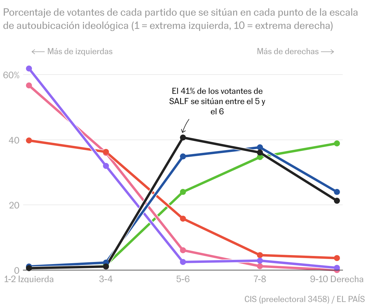 Entre el electorado de SALF había más votantes que se dicen de centro que en el de Vox. De hecho, como muestra el siguiente gráfico, su distribución en el eje izquierda-derecha es muy similar a la de los votantes del PP.