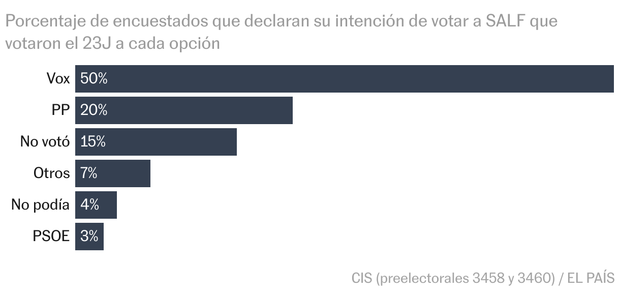 No es raro que los perfiles de Vox y Alvise se parezcan, porque de hecho, la mitad de los votantes de SALF habían votado en las generales de 2023 por el partido de Abascal. En Vox, quizás consciente del tirón que tenía la nueva formación entre su electorado, la obvió durante la campaña.