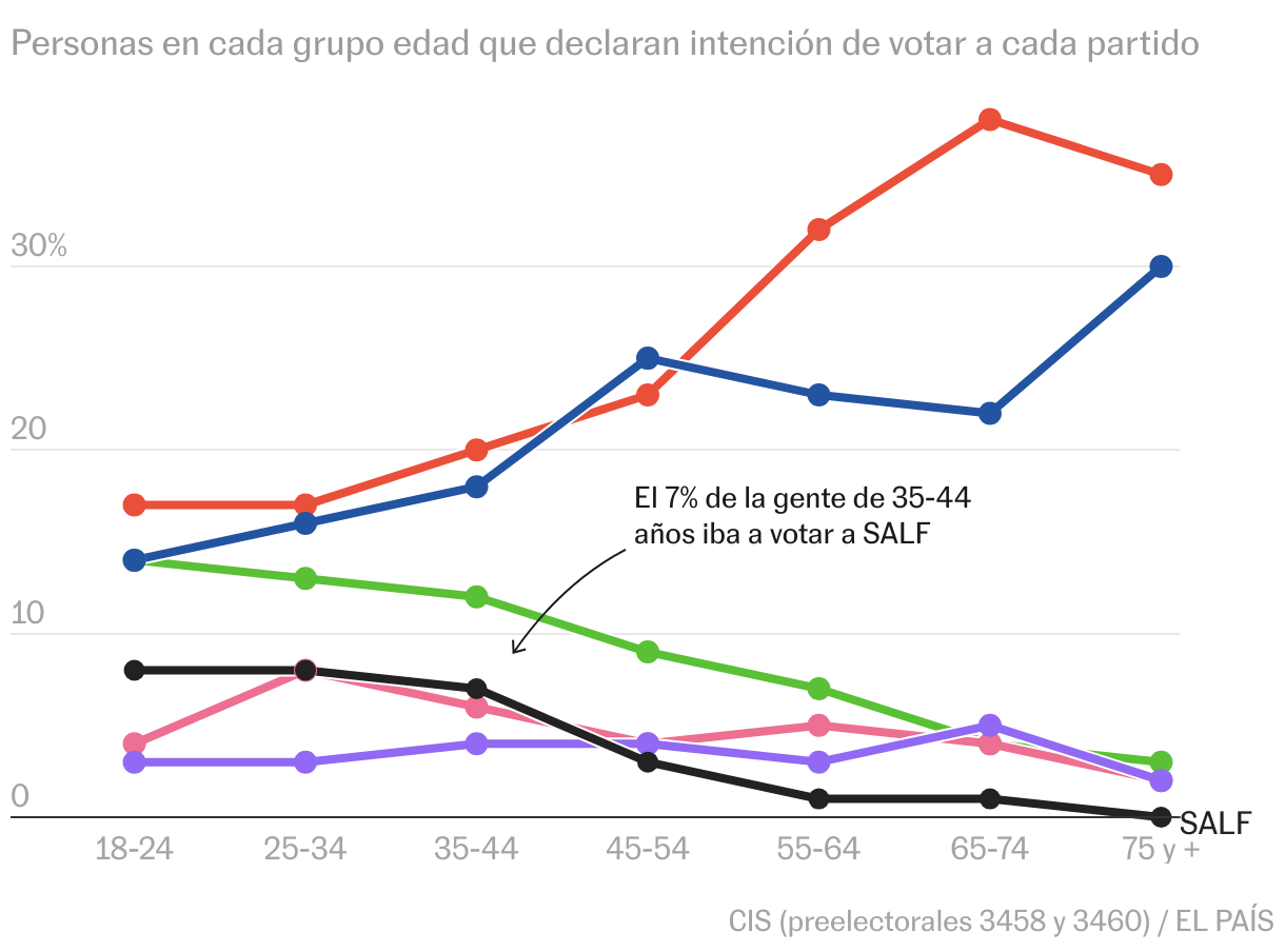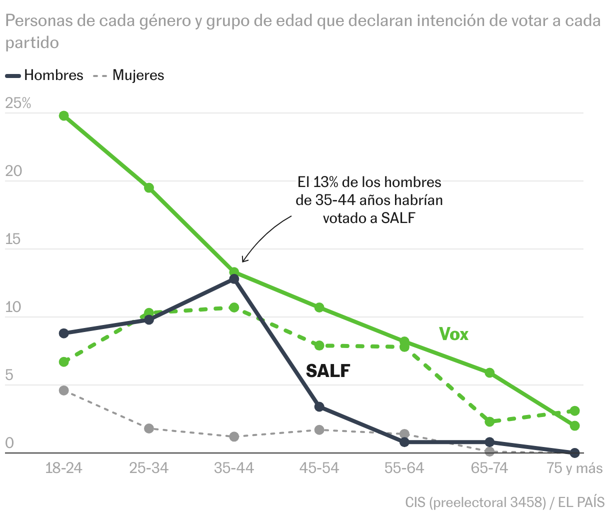 El 75% de los votantes de SALF son hombres. Además, según los datos de la preelectoral, esa diferencia se exacerba con la edad. Entre sus votantes de 18 y 24 años, los hombres duplican a las mujeres. Y entre los de 24 y 44 años, las multiplican por siete.