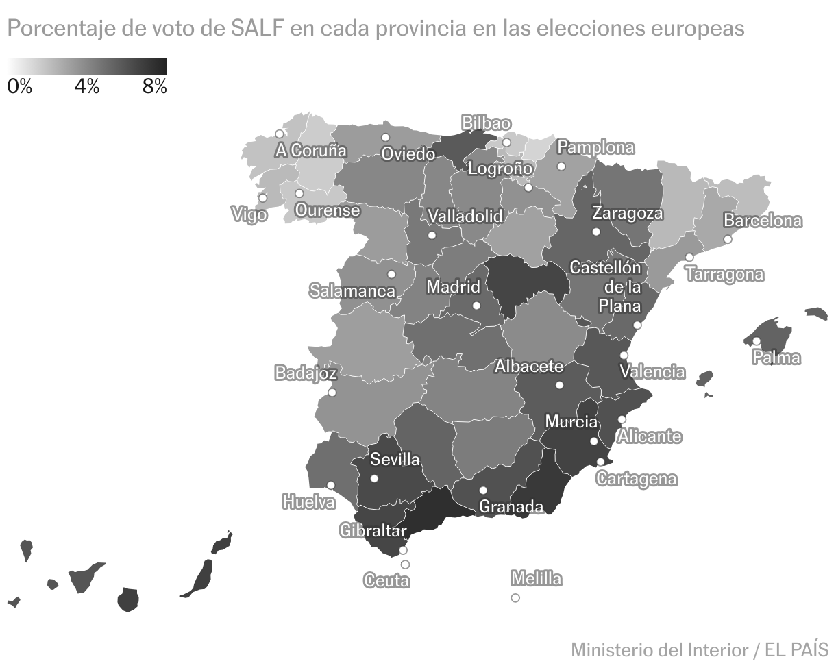 Del análisis territorial de los resultados de las elecciones europeas del pasado domingo destaca el apoyo de SALF en el sur de España, especialmente en el arco mediterráneo meridional. En toda la línea costera que va de Cádiz a Alicante, más del 6% de los electores han votado por SALF, llegando a rondar o superar el 7% en Murcia, Almería o Málaga. En esta última provincia la agrupación ha conseguido su mejor porcentaje, un 7,4%.
