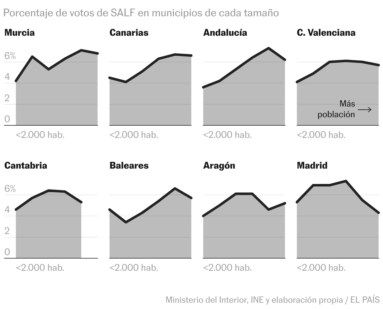 Como es habitual con los nuevos partidos, Alvise ha tenido en estas europeas más votos en las ciudades que en los pueblos. Es un patrón que se observa al analizar los resultados electorales municipio por municipio, y que se repite en la mayoría de comunidades autónomas. En Andalucía, por ejemplo, pasa del 4% de voto en municipios de menos de 10.000 habitantes, para superar el 6% en los que superan ese tamaño.