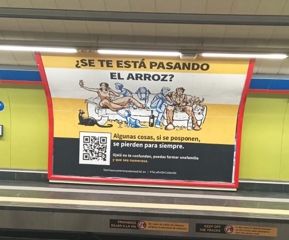 Me costó pillarlo a la primera porque nadie que yo conozca usa la expresión del arroz pasado en esos términos. La última vez que la escuché fue a una tía abuela que murió hace más de 30 años, y ya entonces sonaba rancia y muy desagradable. La Asociación de Familias Numerosas de Madrid, autora de esta campaña procoital, redondea el mensaje con el lema “te la están colando”, muy contradictorio con una publicidad que lamenta justo lo contrario: que no te la cuelan lo suficiente.