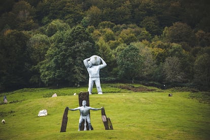 La vía verde del Plazaola tiene 78 kilómetros y atraviesa casi 30 túneles, bastantes más si se consideran como tales los pasos abiertos por los usuarios en la fronda de los hayedos, los robledales y las alisedas ribereñas. Los túneles subterráneos requieren llevar linterna. Los vegetales, en cambio, se iluminan solos con el fulgor de las hojas otoñales. Lekunberri, a medio camino entre Pamplona y San Sebastián, es el mejor punto de partida para recorrer la vía en ambos sentidos. En la antigua estación, hoy oficina de turismo, se pueden alquilar bicicletas y ver un audiovisual sobre la comarca y sobre la historia del tren. Los ciclistas que saben reservan en el asador Epeleta para comer a la vuelta óptimas carnes y pescados a la brasa. Y los que saben más lo hacen en Maskarada, para dar cuenta de los cerdos píos negros (o euskal txerri) que cría el dueño en los prados de Lekunberri. A una hora justa en bici, cerca de Leitza —la ficticia Argoitia de Ocho apellidos vascos—, está Peru Harri, un museo al aire libre creado por el legendario harrijasotzaile Iñaki Perurena, que en el último cuarto del siglo XX levantaba pedruscos como si nada: con una mano, de 267 kilos; con dos, de 320. Cualquier ciclista se siente un alfeñique en este museo dedicado a la piedra y a los forzudos vascos.