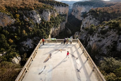 La Foz de Lumbier es un pequeño pero abruptísimo cañón labrado cerca de Sangüesa por el río Irati, en cuyas paredes vertiginosas anidan 200 parejas de buitres leonados, además de alimoches y quebrantahuesos. Se recorre cómodamente siguiendo la vía verde del Irati, el trazado del antiguo ferrocarril de vía estrecha Pamplona-Sangüesa, que circuló de 1911 a 1955 y fue el primer tren eléctrico de pasajeros de España. Desde el aparcamiento hasta el puente del Diablo —una bella obra arruinada por los franceses en 1812— es una hora a pie, ida y vuelta. A pedales, ni la mitad. Por 70 euros, Irati E-Bike ofrece bici eléctrica y guía para recorrer en cuatro horas esta foz y la de Arbaiun, que también es espectacular, con paredes de hasta 400 metros, y más en otoño, cuando hayas, robles, fresnos y quejigos la adornan de rojo, naranja y amarillo.
