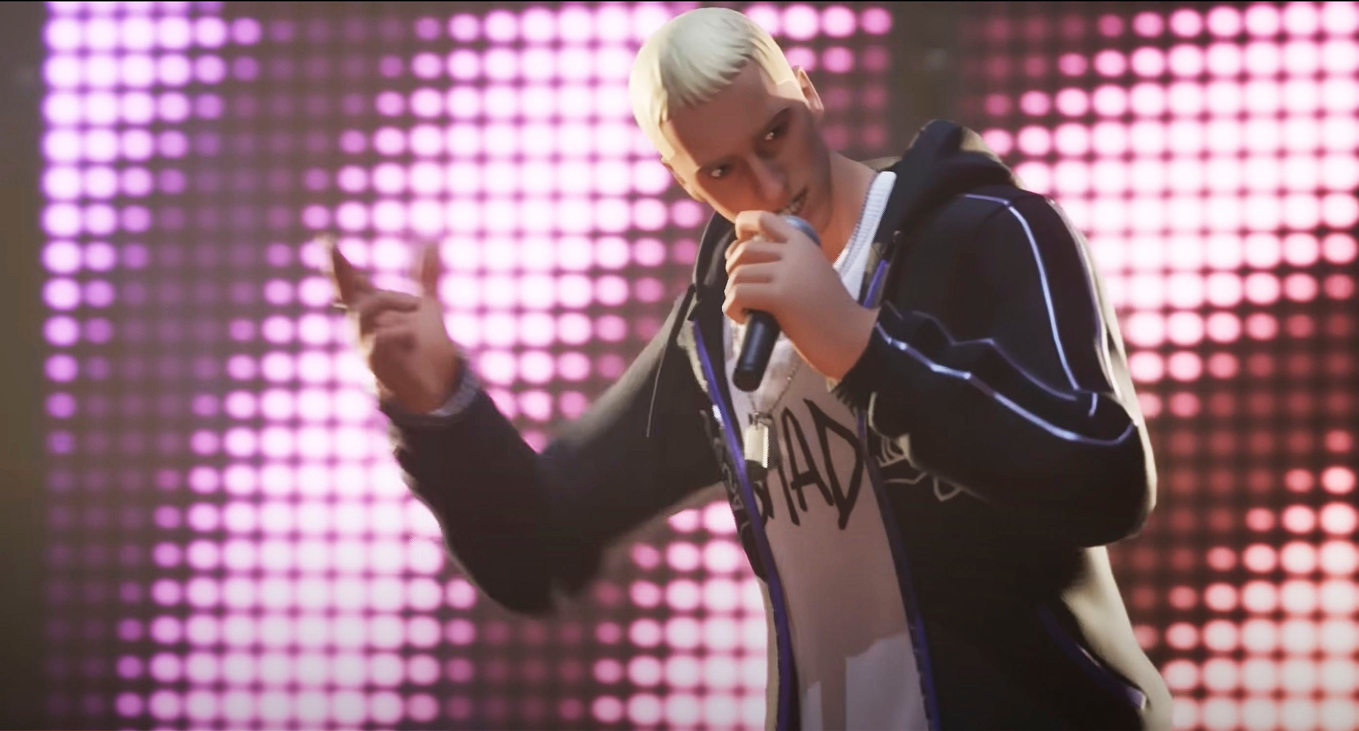 Después de viajar entre partículas subatómicas, átomos, estrellas y galaxias, el jugador llega al mundo de Fortnite y recorre las novedades de la temporada, que incluyen una colaboración con LEGO, carreras y un juego musical al estilo Guitar Hero. La actuación de Eminem es el clímax. Primero interpreta Lose Yourself. Y después aparece Godzilla, o sea, Eminem caracterizado como el monstruo japonés. En este paisaje, el cantante mezcla varios de sus temas, y a los dos o tres minutos desaparece. Muchos fans se quejaron de la corta duración del evento. El Rubius, leyenda del gaming español, se mostró satisfecho: “Estoy contento de haber visto a Eminem, aunque haya sido un concierto virtual y solo dos canciones. Llamadme lo que queráis, tengo cero quejas”.