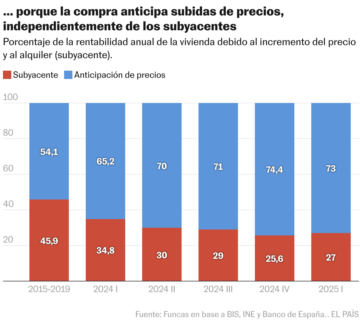 Los bienes inmobiliarios son activos que, contrariamente a los bienes “normales” que se consumen prácticamente en el momento de su adquisición, se pueden revalorizar en el tiempo. El resultado es que la decisión de comprar una vivienda no depende solo de los “fundamentales” del mercado —la relación entre el precio y los ingresos de los hogares, tipos de interés y otros factores subyacentes—: también influye la expectativa de realizar una plusvalía como consecuencia de la subida continuada de los precios.