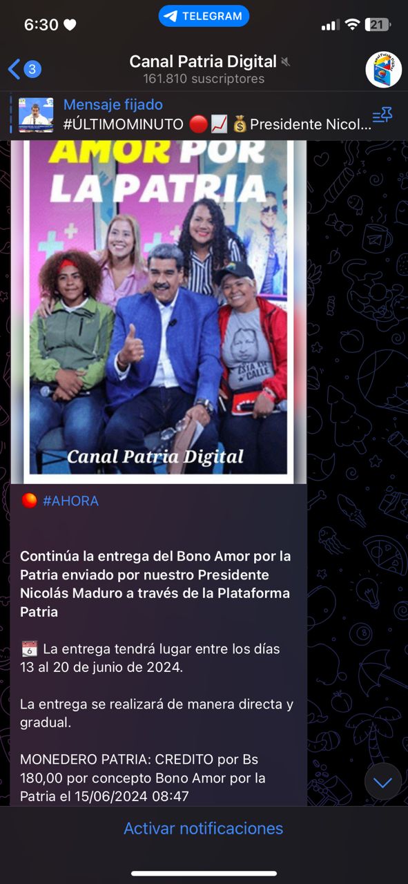 Por tal motivo, con la llegada del mes de junio de 2024 se informó la asignación del Bono Amor Por la Patria, el cual tiene un monto de 180,00 bolívares, y se asignará en la billetera móvil de cada usuario en el Sistema Patria, de manera paliativa y directa.