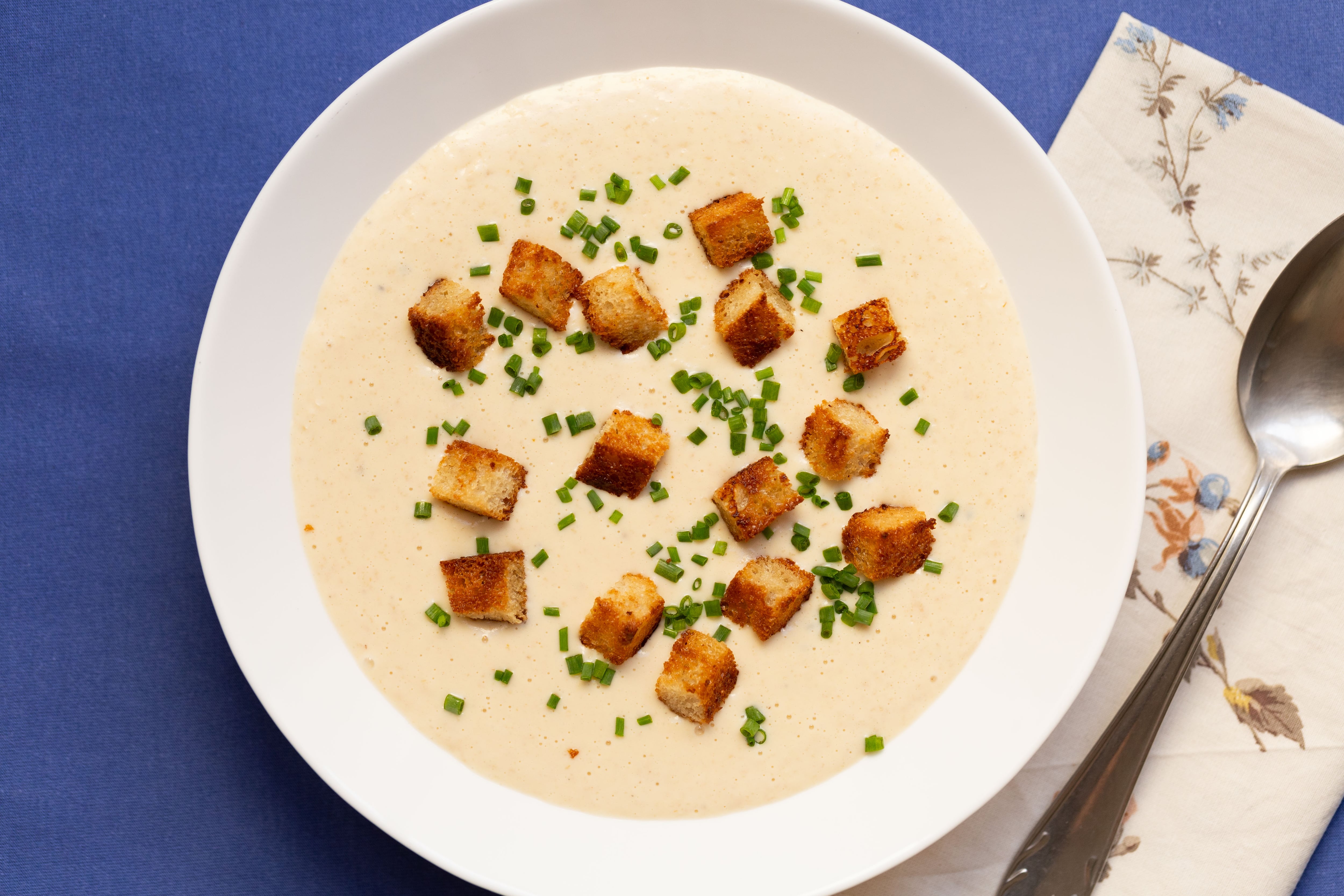 Servir caliente con los dados de pan y cebollino fresco picado.