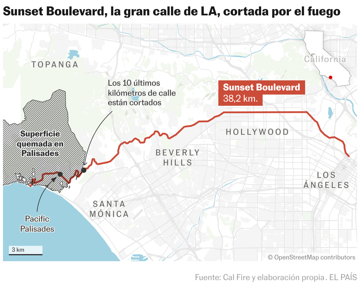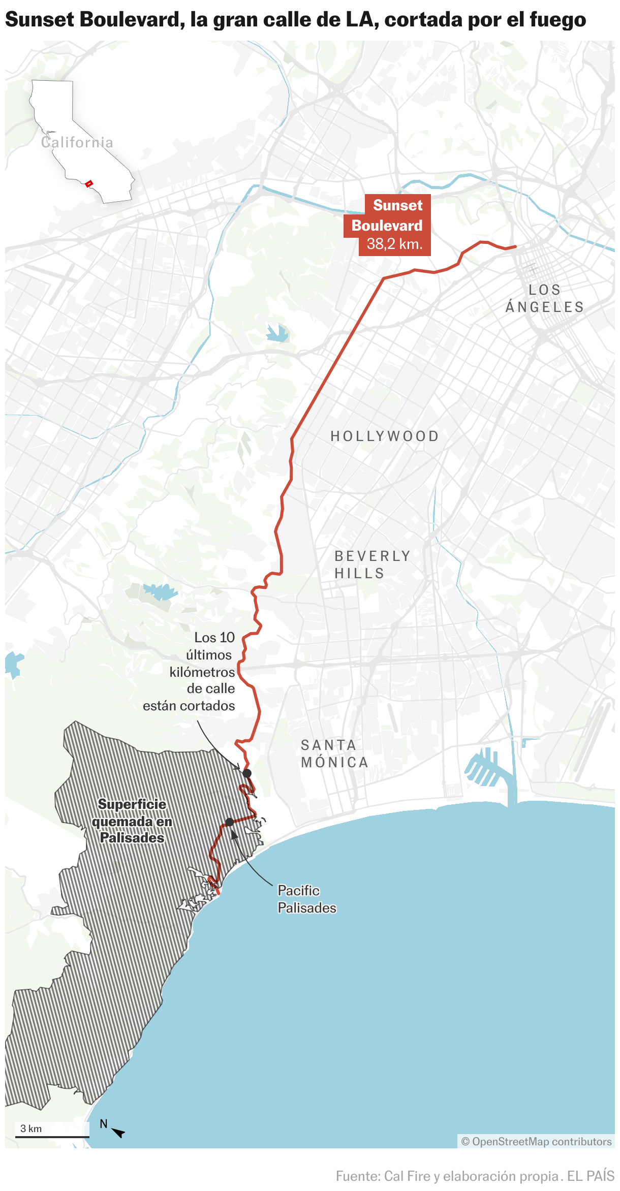 Es la gran señora de Los Ángeles, corazón y arteria de la ciudad, la que fotografían los turistas y desean los negocios. A lo largo de 38 kilómetros y 17.383 números se extiende Sunset Boulevard, el bulevar del atardecer, con sus miles de edificios y sus tantas historias: palmeras por doquier, grandiosas mansiones y decadentes apartamentos, restaurantes de lujo y sencillas hamburgueserías, aun más palmeras, tiendas de lujo y mercados callejeros, parte de Beverly Hills y la Universidad de California. Su longitud cuenta más de 200 años de historia. Desde su origen como ruta para llevar el ganado del centro de Los Ángeles al mar hasta la más reciente y dolorosa, los incendios que han engullido 15.000 hectáreas del condado y ha expulsado a 150.000 personas de sus casas, dejando 16 muertos y 13 desaparecidos. El peor de ellos, el Palisades, se originó al norte y ha arrasado con todo a su paso en los últimos 10 kilómetros de la avenida. Su escénico paisaje está ahora inundado de cenizas.
