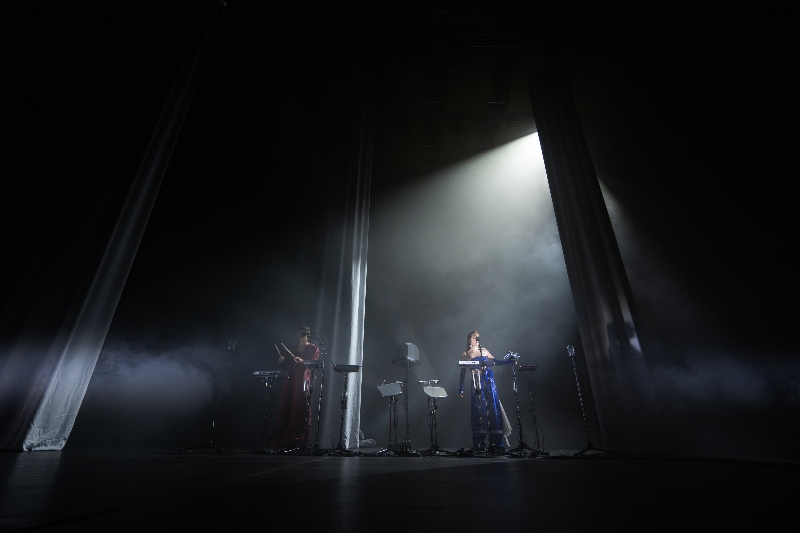 A lo largo del concierto, Helena y Marta tocan instrumentos sampleados, como -aparentemente- una guitarra acústica, reproducen sonidos del mar o samplean sus propios loops vocales. Utilizan teclados y baterías electrónicas diseñadas con formas irregulares: parecen rocas o minerales. La segunda canción del setlist abre con sonidos de lluvia y truenos y el repertorio alterna melodías solemnes y otras alegres y vivaces, como la ‘Si veriash a la rana’, el single de presentación de ‘És pregunta’. El dinámico juego de voces, luces y contundentes percusiones electrónicas crea un pequeño espectáculo audiovisual que hace olvidar de repente la preciosa arquitectura del recinto en el que el público se encuentra.
