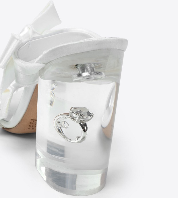 Todos estos zapatos de novia tienen algo en común: cada uno de los modelos lleva un tacón ancho, de metacrilato transparente, de 10,5 centímetros de altura. Pero, lo curioso es que en el interior del tacón se puede ver un perfecto anillo de compromiso. Un solitario que, en esta ocasión, en vez de formar parte de tus dedos, estará en tus zapatos.