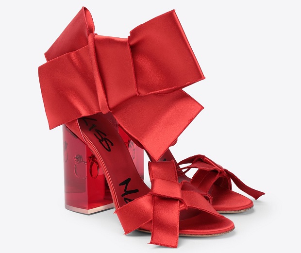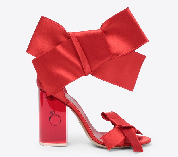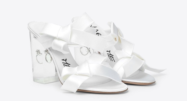 El alto tacón combina a la perfección con los lazos de raso blanco de las sandalias. Completamente destalonadas y con un estilazo maravilloso. En la plantilla se puede leer “Marry Me”, o lo que es lo mismo “Cásate conmigo”. Las puedes comprar en la tienda online de la marca por 1330 dólares.