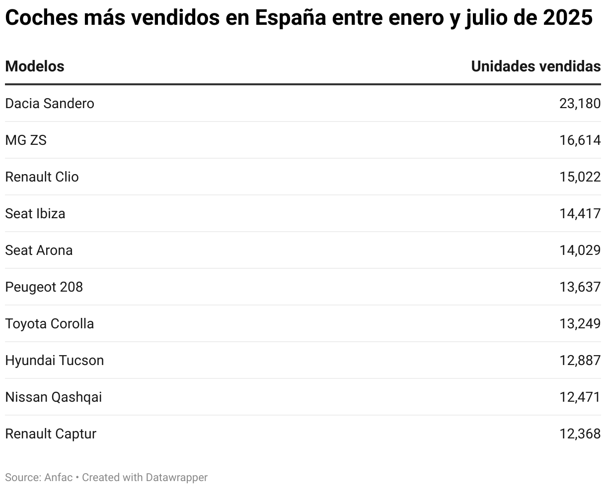 Independientemente de la tecnología de motorización del coche, el modelo más matriculado en lo que va de año ha sido el Dacia Sandero, que también dominó en julio, con 23.180 y 2.814 entregas, respectivamente. En la clasificación del conjunto del año le sigue, a mucha distancia, el MG ZS, el más vendido de la marca china desde su llegada a España, con 16.614 entregas, mientras que el Renault Clio completa el podio, con 15.022 unidades. Los Seat Ibiza y Arona, dos vehículos made in Spain, cierran el top cinco, con 14.417 y 14.029 entregas cada uno.