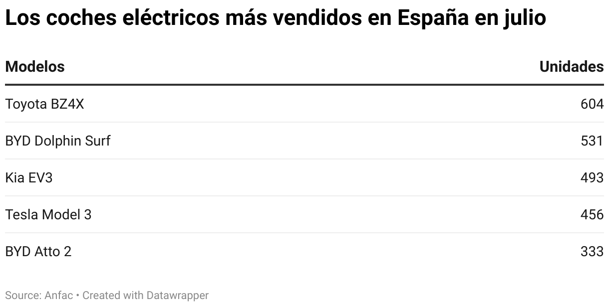 Sin embargo, en julio, ninguno de los dos coches de la estadounidense se han metido en el top 3 eléctrico español. El que ha liderado ha sido el Toyota BZ4X, con 604 ventas, lo que le ha permitido escalar en el acumulado del año hasta el sexto puesto, con 1.912 entregas. En el segundo puesto del mes se ha situado el BYD Dolphin Surf, un vehículo llamado a ser top ventas por su ajustado precio, que va desde los 11.780 euros incluyendo la ayuda del Moves III que adelanta el fabricante, según información de su web. El podio lo cierra el único eléctrico de Kia, el EV3, que con 493 unidades se lleva la medalla de bronce.