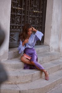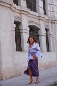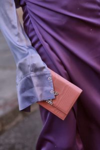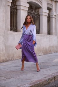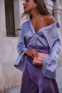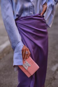 Las faldas pareo son tendencia clave esta temporada. ¿Y, lo mejor de todo?, puedes adaptarlas a looks de invitada o a estilismo de día cargados de estilo, depende de como lo combines. Esta falda de seda morada combinada con mismas tonalidades y superponiendo texturas, me encanta. Rosa, malva y morado. Moiré, glitter, cristal y efecto satinado, todo en uno es la explosión perfecta. Es de Mypeeptoeshop, y también está disponible en amarillo.
