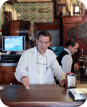 Javier de Rueda, propietario, anotando la cuenta sobre la antigua barra de madera. Cedida por El Rinconcillo