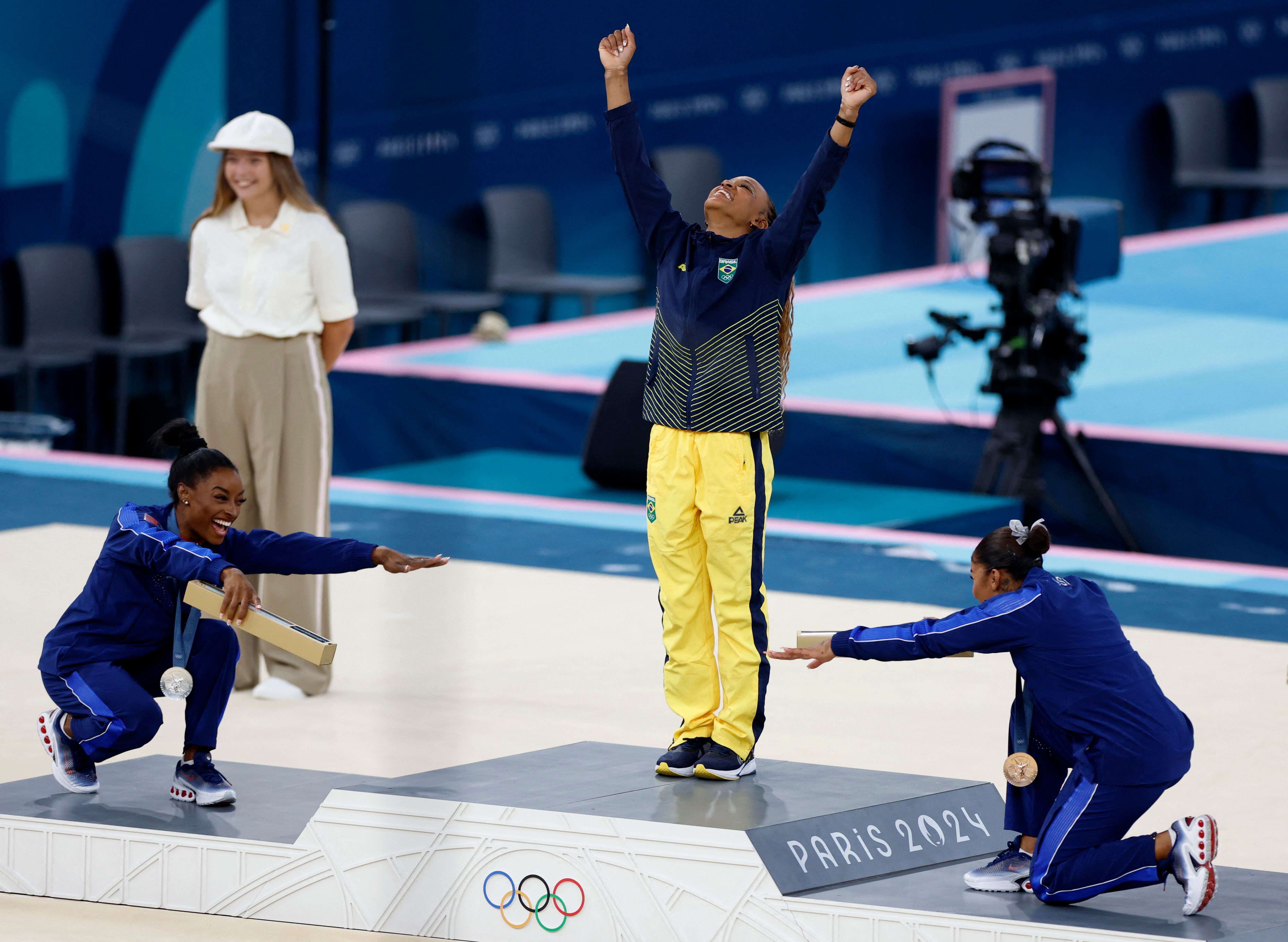 Tres gimnastas en el podio, por primera vez tres mujeres negras. En el centro, la brasileña Rebeca Andrade, brazos en alto, contentísima, es reverenciada por las atletas estadounidenses Simone Biles y Jordan Chiles, plata y bronce, respectivamente, en la final de suelo. La imagen reaparecerá en cada montaje sobre gimnasia artística, sobre París 2024, sobre los Juegos y sobre el espíritu olímpico así en general porque es una de esas fotos.