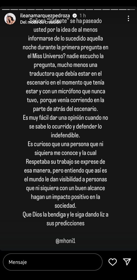 La cuarta finalista del Miss Universo no se ha quedado callada. En sus historias de Instagram, salió al paso para contestar a Mhoni Vidente.
