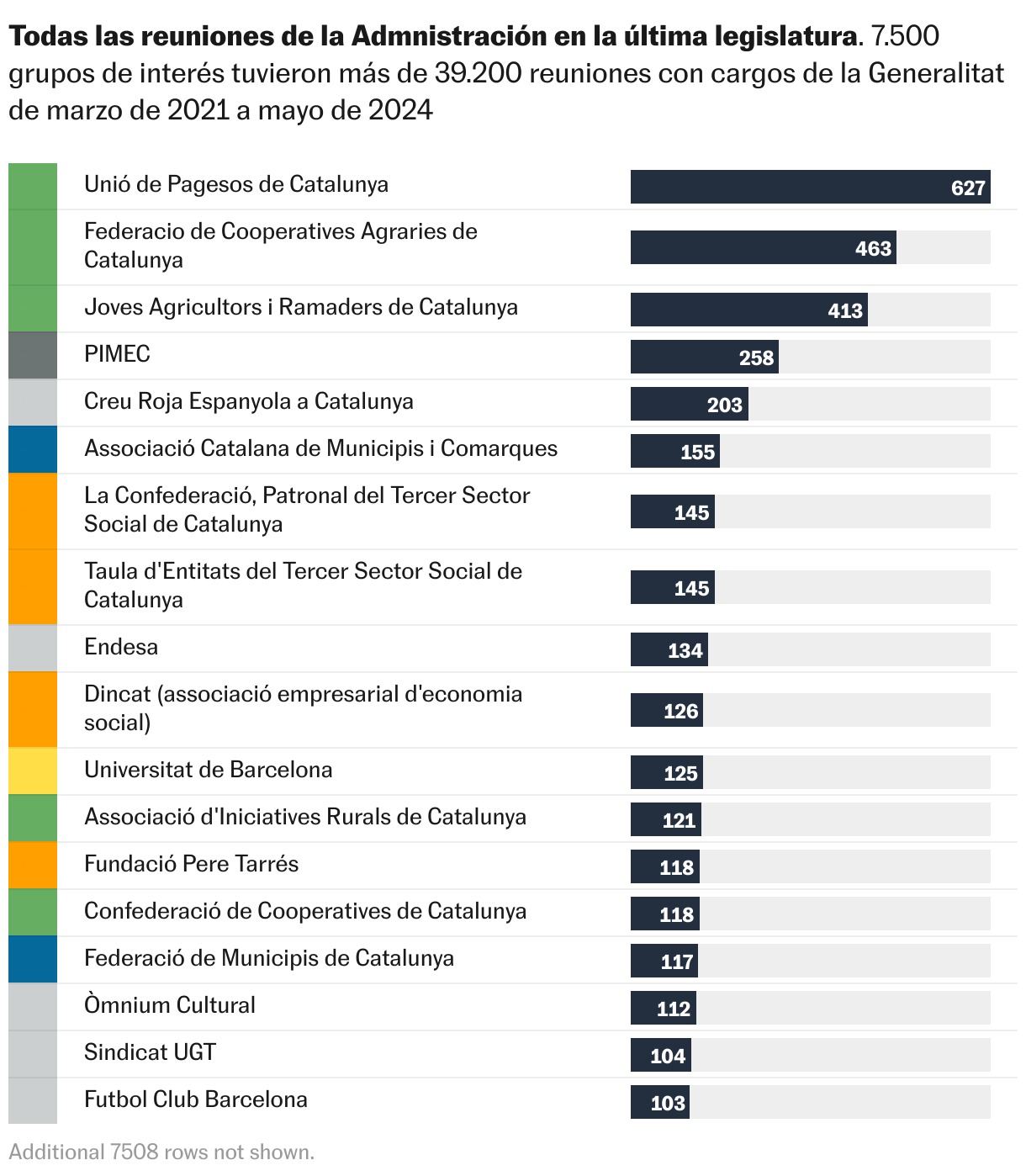 Pese a las abultadas cifras, el análisis de los datos entre marzo de 2021 y junio pasado muestra que el 43% de esas organizaciones solo ha pedido contactar de manera puntual. Si se mira a las que han tenido más de 50 encuentros, la lista se reduce a 83 lobbies. Y a solo 18, con el Fútbol Club Barcelona (103) como la última de ese bloque, si se pone la lupa en el rango de más de un centenar. Tras el triunvirato del sector agrícola (lidera en números absolutos Unió de Pagesos con 628), están Creu Roja (203), PIMEC (196), la Asociación Catalana de Municipios (155), la Mesa del Tercer Sector (145) y la patronal del tercer sector, La Confederación (145).