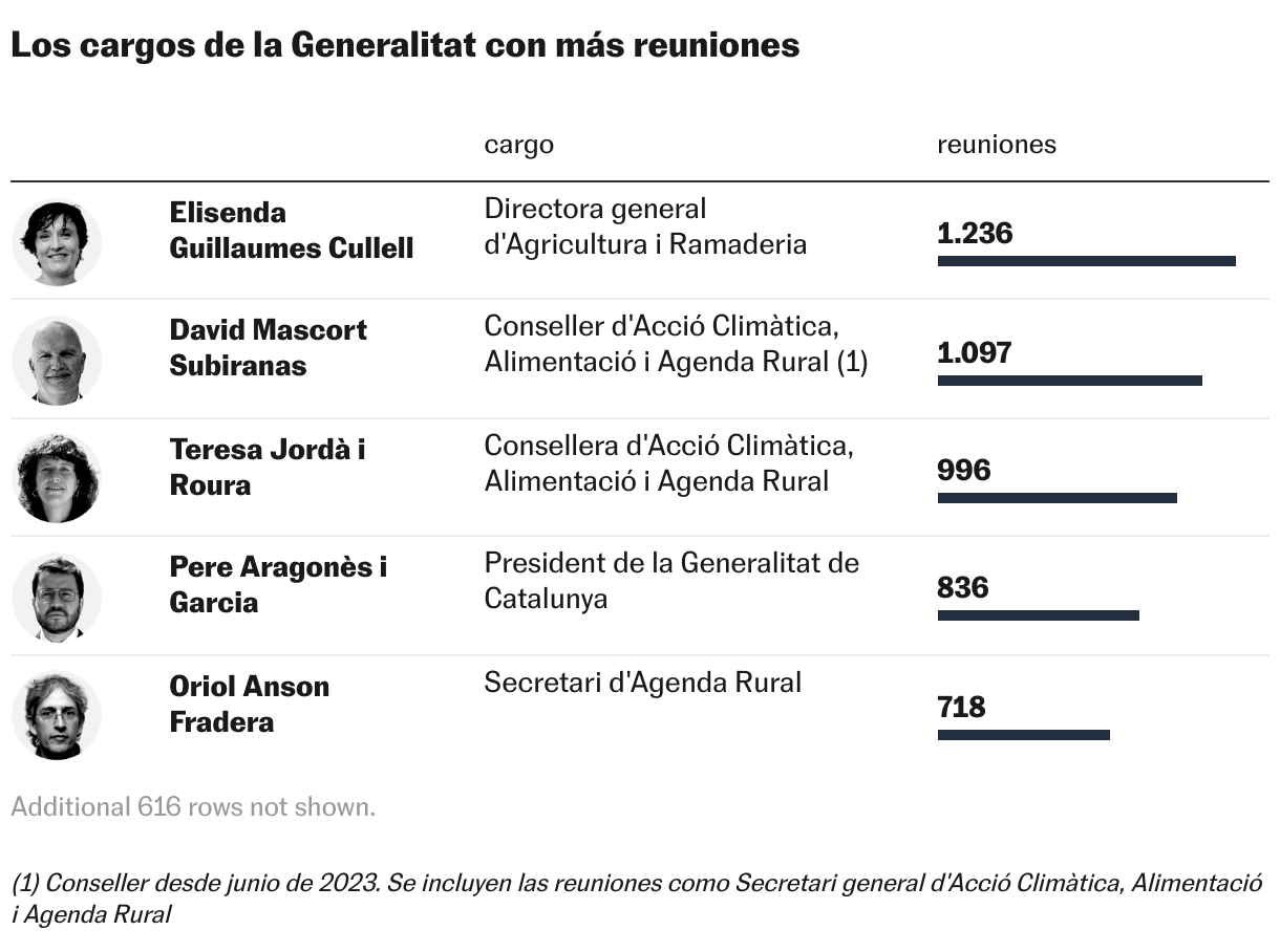El predominio del sector agrario queda de manifiesto también si el foco se pone en cuáles son los departamentos y altos cargos que acumulan más encuentros registrados en sus agendas. Con un total de 1.236 visitas, la secretaria de Agricultura, Elisenda Guillaumes, fue la que más encuentros tuvo hasta mayo, la fecha final consultada pese a que el cambio de Govern fue en agosto. Los dos consejeros que ocuparon la cartera de Acción Climática, Alimentación y Agenda Rural le siguen en la lista. La agenda de Teresa Jordà consigna 996 reuniones y su predecesor, David Mascort, 961 en ese cargo más 127 cuando fue el número dos de la consejería. El entonces president Pere Aragonès va de siguiente en la clasificación (836), aunque con una agenda mucho más variada: fue Ómnium Cultural fue el grupo de interés con que más contacto (17) y después le sigue Fira de Barcelona (10) y Pimec (9).