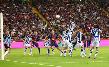 El Barça había roto a jugar a partir del criterio de Pedri. Apretaba más, abría mejor el campo y exigía mucho a la Real. El empate, sin embargo, llegó en el octavo saque de esquina botado por Rashford y cabeceado en el primer palo por Koundé. Las jugadas a balón parado han sido el mejor recurso para los últimos partidos del Barcelona. El empate invitaba en cualquier caso a reflexionar durante el descanso y Flick sustituyó a Dro por el discontinuo Olmo y mandó calentar a Lamine. La Real ni se inmutó y empezó a atacar a los laterales azulgrana con la profundidad de jugadores como Barrenetxea. La contienda se abrió para diversión del público y suerte del Barcelona, más a gusto cuando tiene campo para correr, afortunado ya por disponer por fin de Lamine.