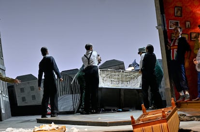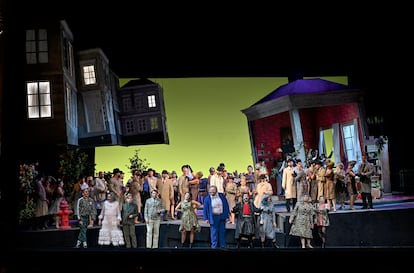 Las primeras partes de los tres actos se desarrollan en un espacio mínimo que nos desvela una gran bandera británica desteñida parcialmente enrollada y con la mugre que han dejado en varios sitios los cercos de las jarras de vino o cerveza, trasunto inequívoco del estado de las finanzas y de la principal afición de Falstaff. Nada más sentarse en una silla, entre platos con restos de comida apilados a sus pies y una pequeña foto oficial de Isabel II en la pared del fondo por toda decoración, el suelo cede y su trompazo coincide con el primer acorde de la orquesta. A partir de ahí, toda la acción avanza tersa y ágil gracias a aquello que más había faltado en Otello: una meticulosa dirección de actores, plagada de pequeños detalles y siempre en connivencia con la música. El decorado de las calles y las casas de Windsor abunda también en irregularidades y en suelos en pendiente, como si todos los personajes corrieran el riesgo de deslizarse en cualquier momento ―volviendo a citar a Verdi― “por el camino que conduce hacia la locura”. Con medios sencillos, sin incurrir en excesos y sin forzar la comicidad intrínseca del soberbio libreto de Boito, Spirei consigue que todo resulte creíble y que afloren constantemente las sonrisas.