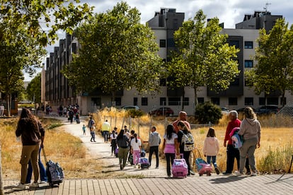 Padilla teletrabaja como comercial. Su esposa, en teleasistencia en la capital madrileña. “En mi edificio somos muchos de mi edad, que buscamos tranquilidad y poder pagar la casa”, relata al lado de su casa, a escasos metros del colegio, donde ahora salen los chavales de secundaria. “Ha venido mucha más gente últimamente. Hay tanta ahora que hoy se ha convertido en un ensanche más”, aprecia.