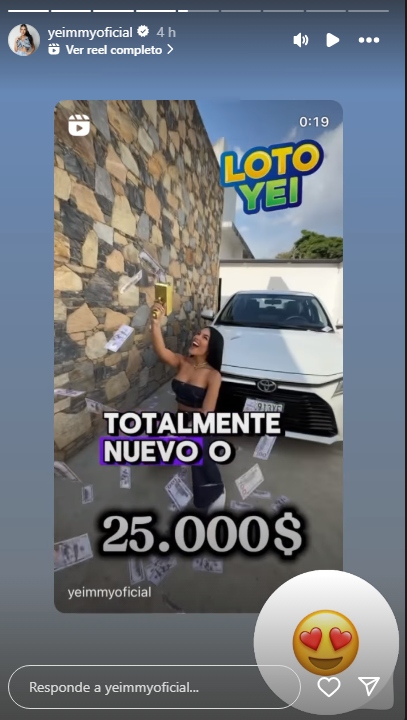 A través de sus historias en la red social Instagram, la expresentadora de televisión dejó un clip rifando un vehículo completamente nuevo o su equivalente en dólares, lo que generó la intriga de sus seguidores por el regalo tan costoso.